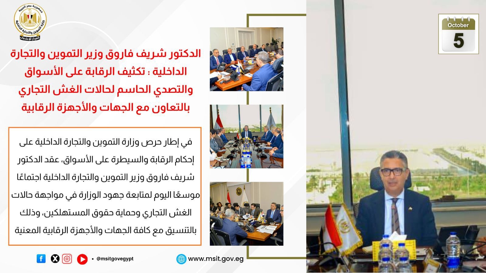 عقد الدكتور شريف فاروق وزير التموين والتجارة الداخلية اجتماعًا موسعًا مع رئيس جهاز حماية المستهلك ومدير الإدارة العامة لشرطة التموين والتجارة الداخلية وقيادات الوزارة، حيث أكد على تكثيف حملات الرقابة على الأسواق والتصدي الحاسم لممارسات الغش التجاري بالتعاون مع الأجهزة الرقابية، بما يضمن استقرار المنظومة السوقية وحماية المواطنين.