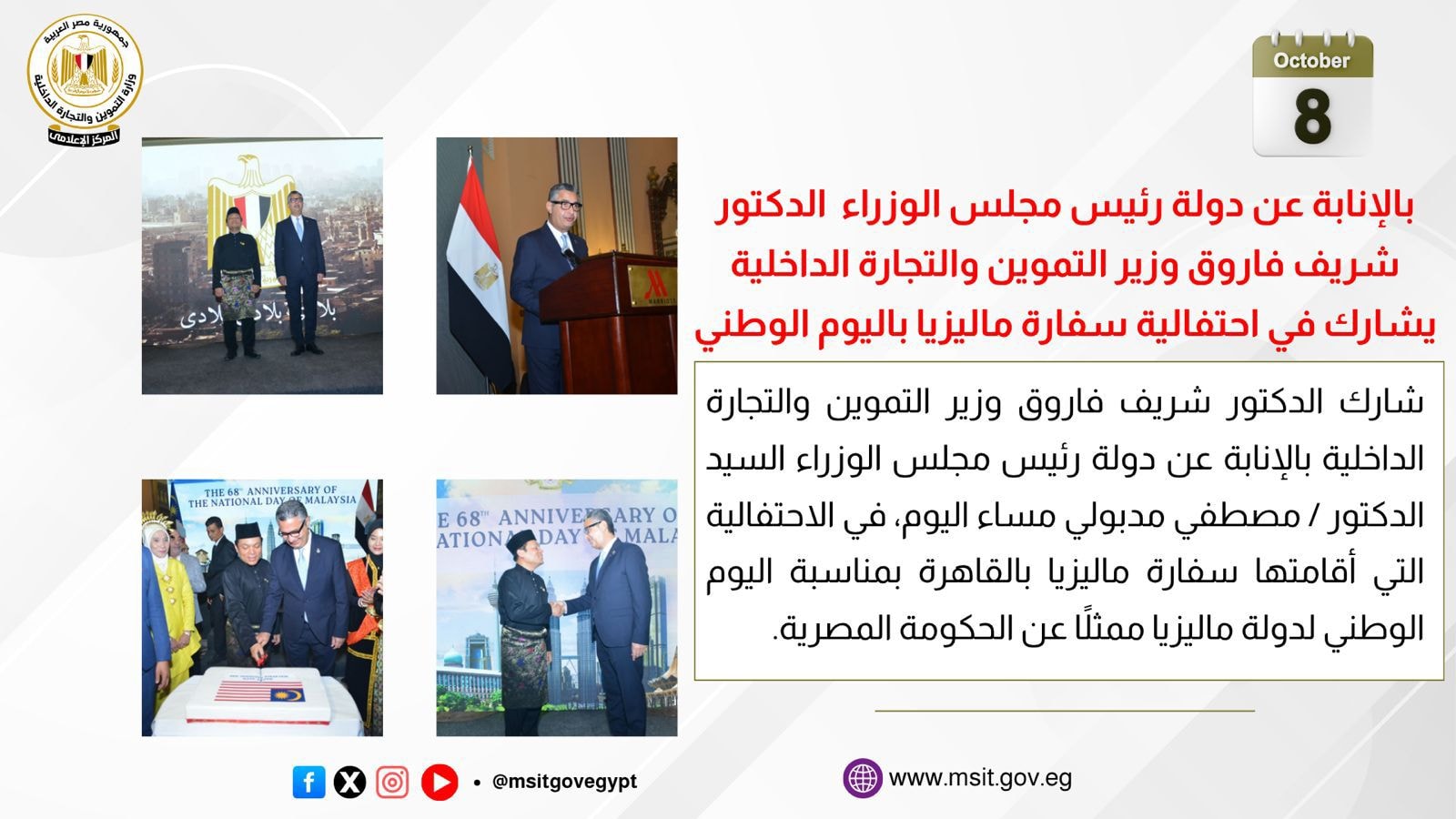 واختتم الوزير نشاطه الأسبوعي بالمشاركة نيابة عن دولة رئيس مجلس الوزراء في احتفالية سفارة ماليزيا باليوم الوطني، بحضور عدد من الوزراء والسفراء وممثلي الهيئات الدولية، تأكيدًا على حرص الدولة المصرية على تعزيز علاقاتها الدبلوماسية والاقتصادية مع الدول الصديقة.