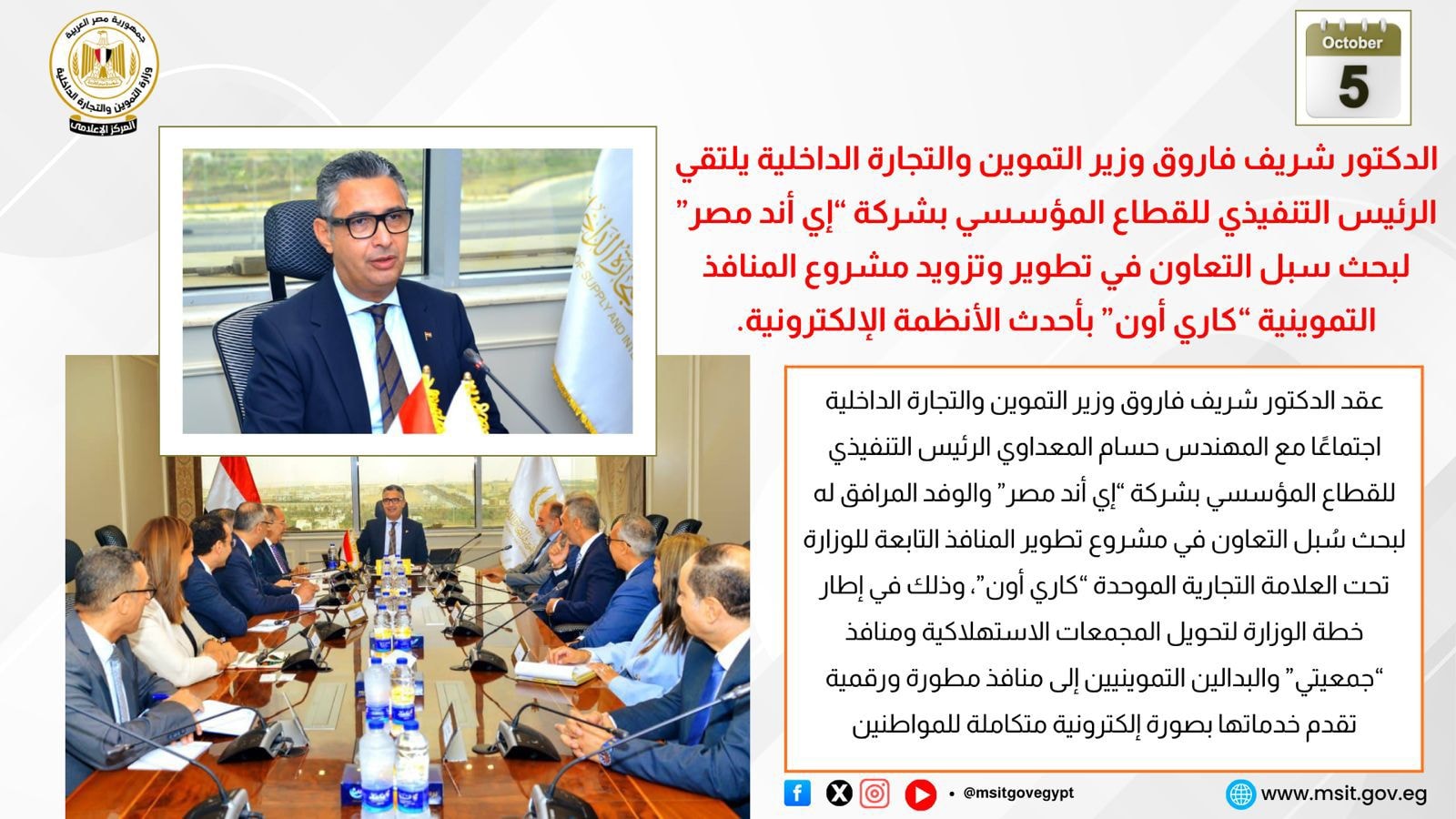 في إطار خطة الوزارة للتحول الرقمي الشامل ورفع كفاءة منظومة البيع والتوزيع، عقد الوزير لقاءً مع الرئيس التنفيذي للقطاع المؤسسي بشركة “إي أند مصر” لبحث سبل التعاون في تطوير وتزويد مشروع المنافذ التموينية “كاري أون” بأحدث الأنظمة الإلكترونية.