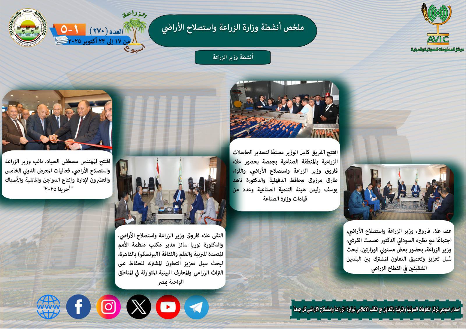 وسلط الانفوجراف الضوء على افتتاح الفريق كامل الوزير نائب رئيس الوزراء مصنعًا لتصدير الحاصلات الزراعية بالمنطقة الصناعية بجمصة بحضور علاء فاروق وزير الزراعة واستصلاح الأراضي، واللواء طارق مرزوق محافظ الدقهلية والدكتورة ناهد يوسف رئيس هيئة التنمية الصناعية، بينما عقد علاء فاروق، وزير الزراعة واستصلاح الأراضي، اجتماعًا مع نظيره السوداني الدكتور عصمت القرشي، وزير الزراعة، بحضور بعض مسئولي الوزارتين، لبحث سُبل تعزيز وتعميق التعاون المشترك بين البلدين الشقيقين في القطاع الزراعي