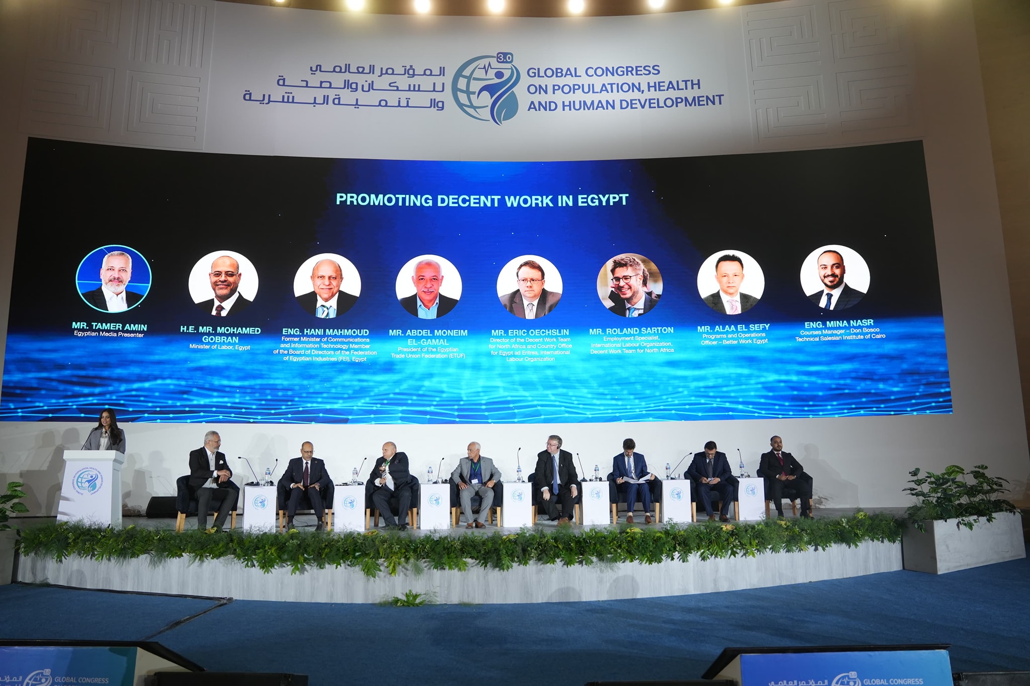 في إطار فعاليات اليوم الثاني من النسخة الثالثة من المؤتمر العالمي للسكان والصحة والتنمية البشرية (PHDC’25) الذي يُعقد تحت رعاية فخامة الرئيس عبدالفتاح السيسي رئيس الجمهورية، وافتتحه دولة رئيس مجلس الوزراء الدكتور مصطفى مدبولي أول أمس الأربعاء،وبحضور د. خالد عبدالغفار نائب رئيس مجلس الوزراء لشئون التنمية البشرية ووزير الصحة والسكان، نظمت وزارة العمل مساء أمس الخميس جلسة خاصة بعنوان “تعزيز العمل اللائق في مصر”، وذلك ضمن أعمال المؤتمر الذي ينعقد بالعاصمة الإدارية الجديدة خلال الفترة من 12 إلى 15 نوفمبر 2025 تحت شعار “تمكين الأفراد.. تعزيز التقدم.. إتاحة الفرص”. ويُعد المؤتمر منصة عالمية تجمع نخبة من القادة والخبراء وصناع السياسات ورواد الابتكار، لبحث قضايا الصحة الشاملة والديناميكيات السكانية والهجرة وتمكين الشباب والتحول الرقمي واقتصاد الرعاية الصحية، بما يتماشى مع أهداف رؤية مصر 2030 وأجندة التنمية المستدامة للأمم المتحدة.