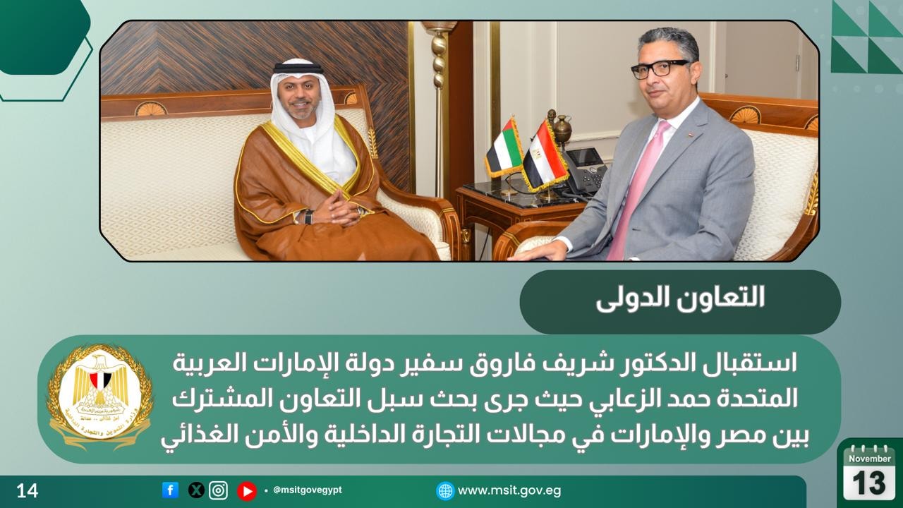 وبمقر الوزارة بالعاصمة الجديدة استقبل الدكتور شريف فاروق، وزير التموين والتجارة الداخلية، السفير حمد عبيد الزعابي، سفير دولة الإمارات العربية المتحدة لدى جمهورية مصر العربية، وخلال اللقاء تم مناقشة سُبل تعزيز التعاون المشترك بين البلدين وتبادل الخبرات في ملفات التموين والأمن الغذائي والتجارة الداخلية، والفرص الاستثمارية المتاحة.