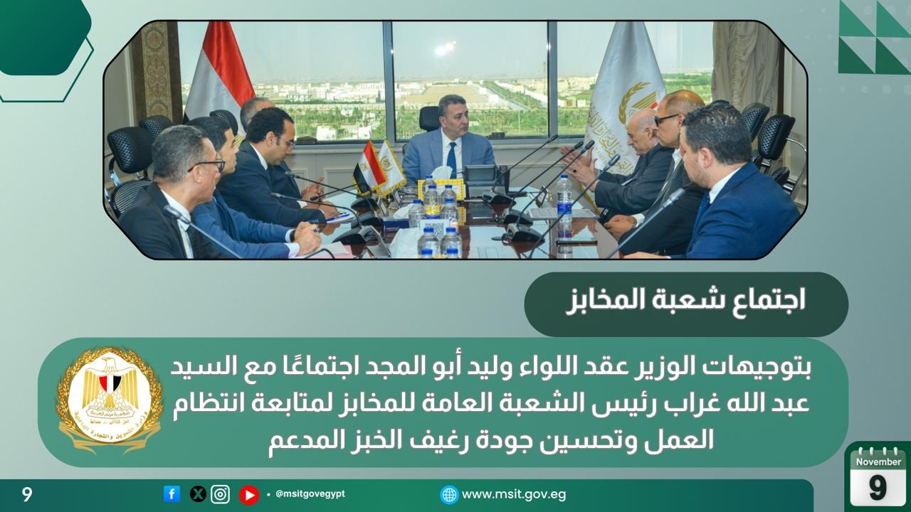 وفي اطار تنفيذ توجيهات الدكتور شريف للاطمئنان على انتظام عمل منظومة الخبز المدعم، اجتمع اللواء وليد أبو المجد نائب وزير التموين اجتماعًا مع السيد عبد الله غراب رئيس الشعبة العامة للمخابز، وذلك للاطمئنان على انتظام عمل المخابز البلدية المدعمة على مستوى الجمهورية، ودراسة مطالب ومقترحات الشعبة العامة للمخابز.
