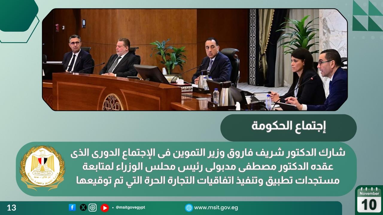 شارك الدكتور شريف فاروق وزير التموين في الإجتماع الدورى الذى عقده الدكتور مصطفى مدبولى رئيس مجلس الوزراء لمتابعة مستجدات تطبيق وتتفيذ اتفاقيات التجارة الحرة التي تم توقيعها.