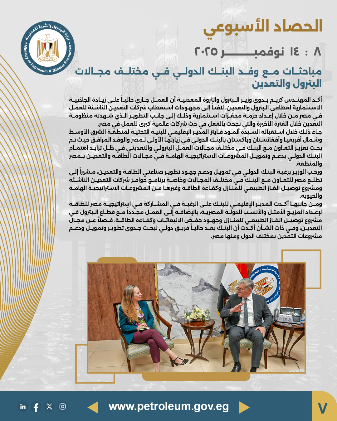 أصدرت وزارة البترول والثروة المعدنية الحصاد الأسبوعي حول أبرز أنشطة الوزارة خلال الأسبوع المنقضي، وما شهده من اجتماعات ومشاركات للمهندس كريم بدوي وزير البترول والثروة المعدنية، في إطار متابعة تنفيذ محاور استراتيجية الوزارة