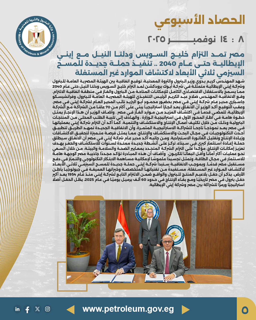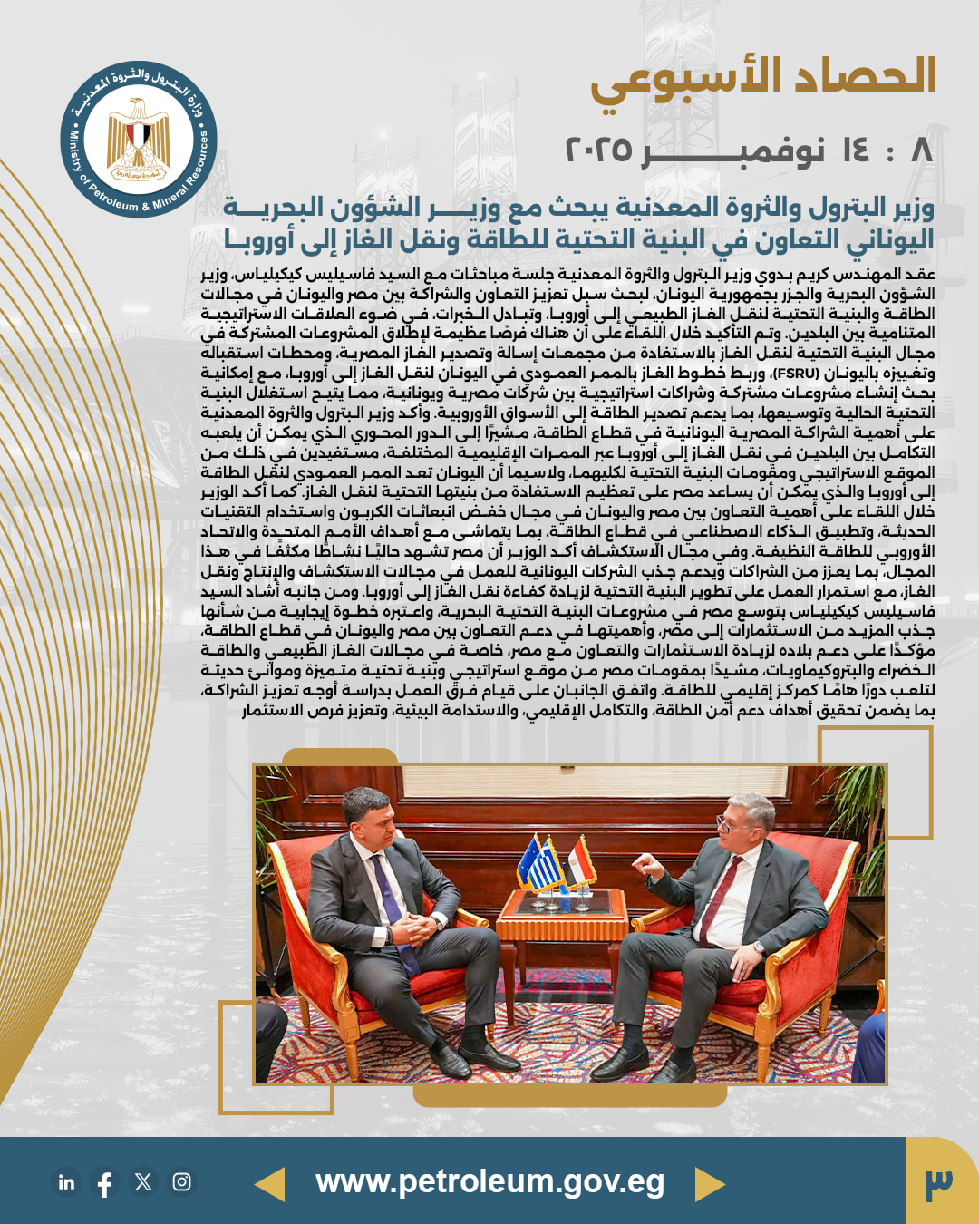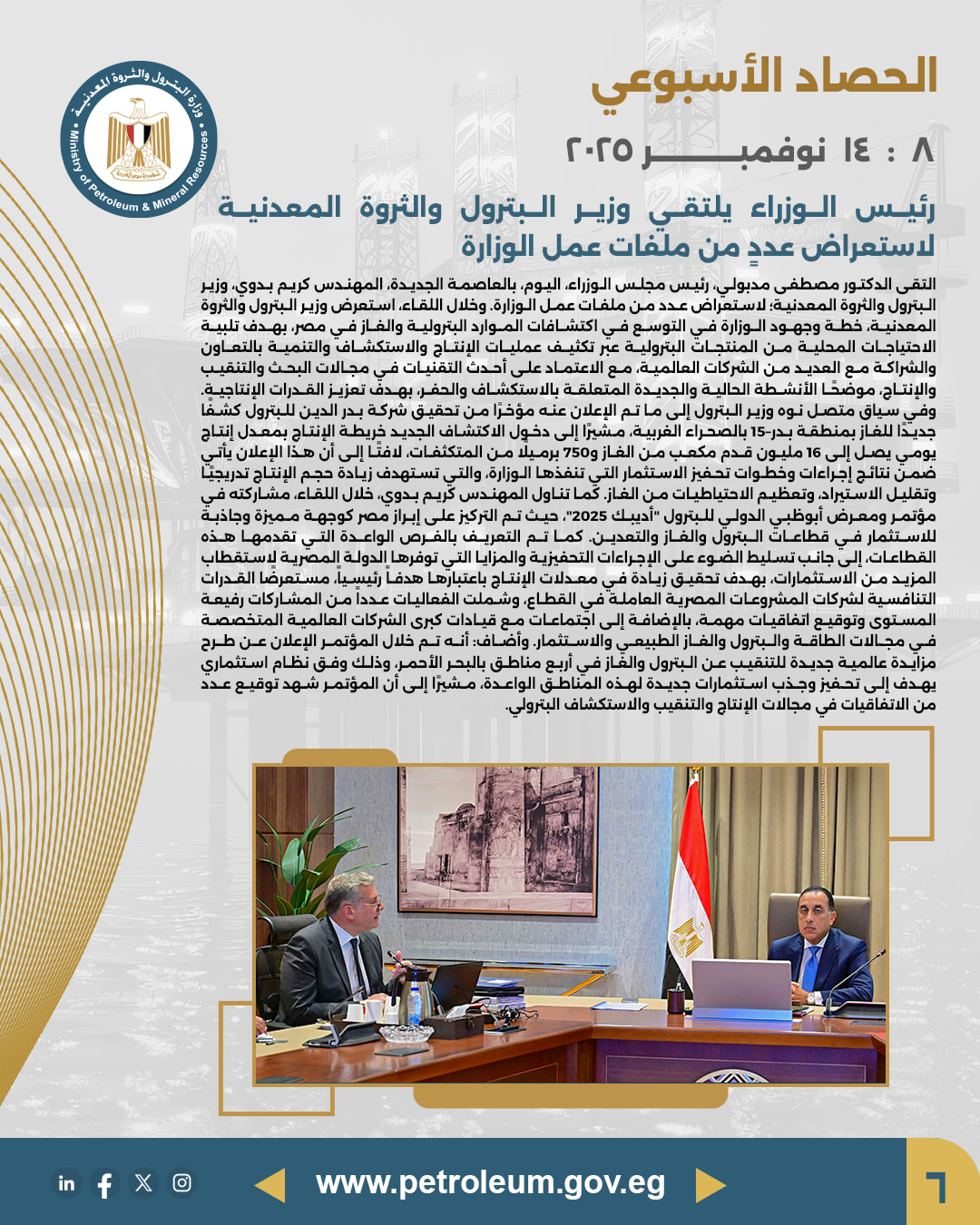 أصدرت وزارة البترول والثروة المعدنية الحصاد الأسبوعي حول أبرز أنشطة الوزارة خلال الأسبوع المنقضي، وما شهده من اجتماعات ومشاركات للمهندس كريم بدوي وزير البترول والثروة المعدنية، في إطار متابعة تنفيذ محاور استراتيجية الوزارة