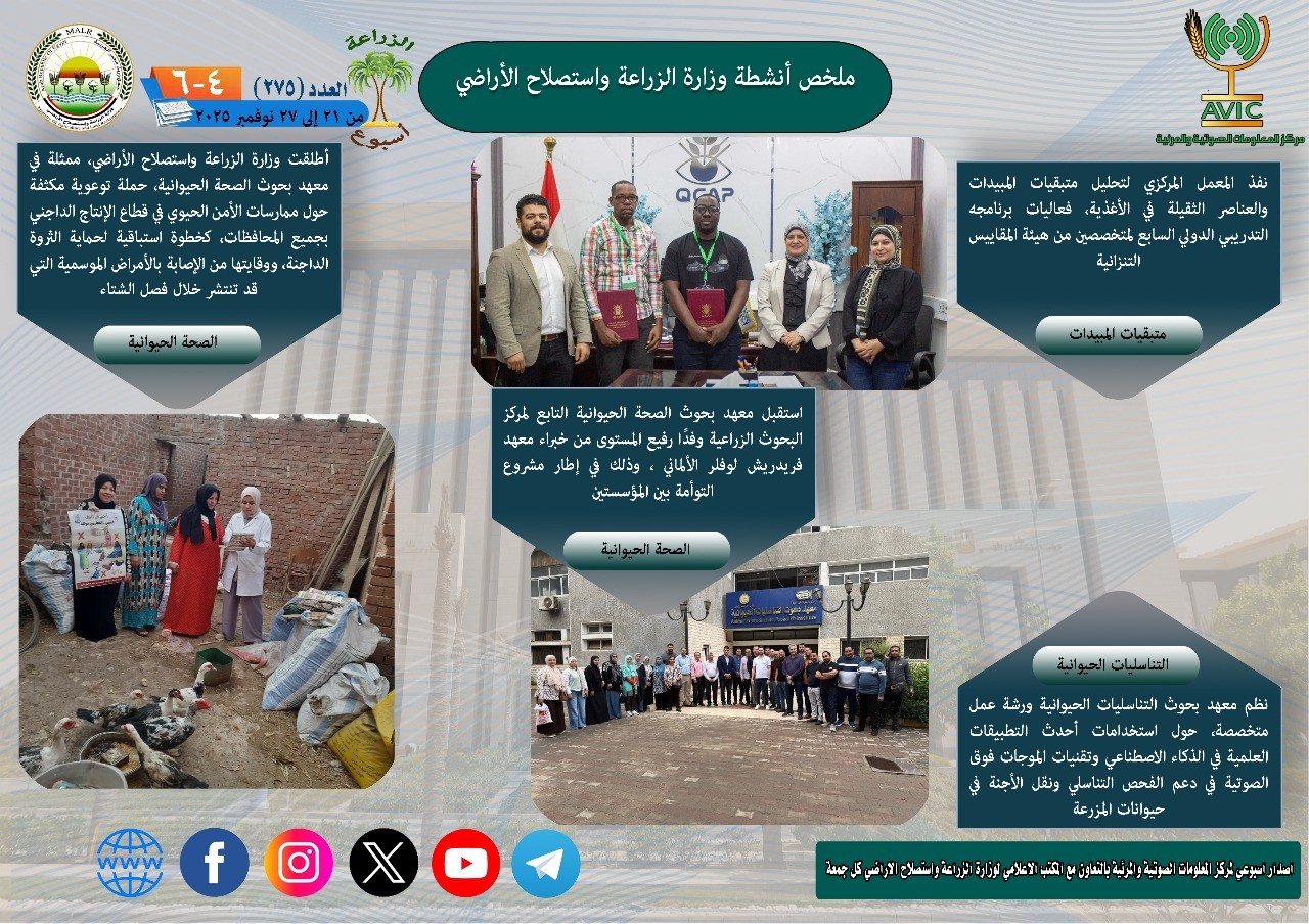 أصدر مركز المعلومات الصوتية والمرئية بوزارة الزراعة واستصلاح الأراضي، “الانفوجراف الاسبوعي” في نسخته رقم 275 حول الحصاد الاسبوعي لأهم أنشطة الوزارة، خلال الاسبوع الماضي في الفترة من 21 وحتى 27 نوفمبر الجاري، كما أصدر المركز ايضا ملخصا بالفيديو، حول انشطة الوزارة خلال نفس الفترة.