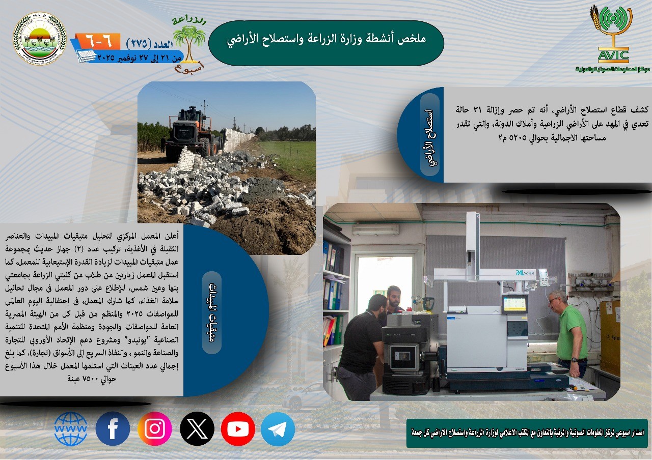 بينما أعلن المعمل المركزي لتحليل متبقيات المبيدات والعناصر الثقيلة في الأغذية، تركيب عدد (2) جهاز حديث بمجموعة عمل متبقيات المبيدات لزيادة القدرة الإستيعابية للمعمل، كما استقبل المعمل زيارتين من طلاب من كليتي الزراعة بجامعتي بنها وعين شمس، للإطلاع على دور المعمل فى مجال تحاليل سلامة الغذاء، كما شارك المعمل، فى إحتفالية اليوم العالمى للمواصفات 2025 والمنظم من قبل كل من الهيئة المصرية العامة للمواصفات والجودة ومنظمة الأمم المتحدة للتنمية الصناعية “يونيدو” ومشروع دعم الإتحاد الأوروبى للتجارة والصناعة والنمو ، والنفاذ السريع إلى الأسواق (تجارة)، كما بلغ إجمالي عدد العينات التي استلمها المعمل خلال هذا الأسبوع حوالي 7500 عينة.
