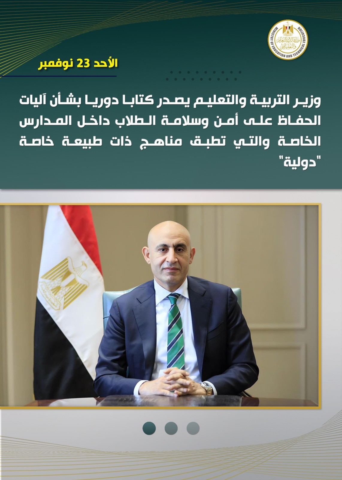 فى إطار حرص وزارة التربية والتعليم والتعليم الفني على أمن وسلامة أبنائنا الطلاب، أصدر السيد محمد عبد اللطيف وزير التربية والتعليم والتعليم الفني الكتاب الدوري رقم “١٩” بشأن آليات الحفاظ على أمن وسلامة الطلاب داخل المدارس الخاصة والمدارس التى تطبق مناهج ذات طبيعة خاصة “دولية”، والتي تتضمن التعليمات الأتية: