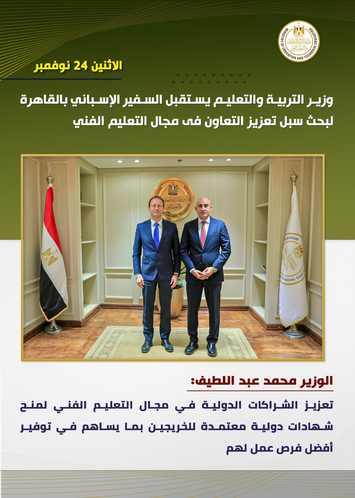 استقبل السيد محمد عبد اللطيف، وزير التربية والتعليم والتعليم الفني، السفير سيرجيو كارنزا، سفير دولة إسبانيا بالقاهرة، لبحث أوجه التعاون الثنائي بين مصر وإسبانيا في مجال التعليم الفني والتقني، واستعراض سبل تطوير البرامج التعليمية بما يتوافق مع المعايير الدولية.