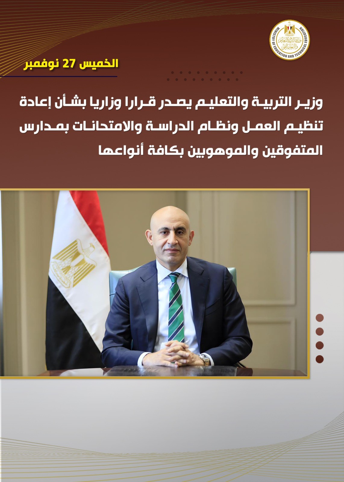 أصدر السيد محمد عبد اللطيف وزير التربية والتعليم والتعليم الفني القرار رقم (303) بشأن إعادة تنظيم العمل ونظام الدراسة والامتحانات بمدارس المتفوقين والموهوبين بكافة أنواعها، وذلك بعد موافقة المجلس الأعلى للتعليم قبل الجامعي.