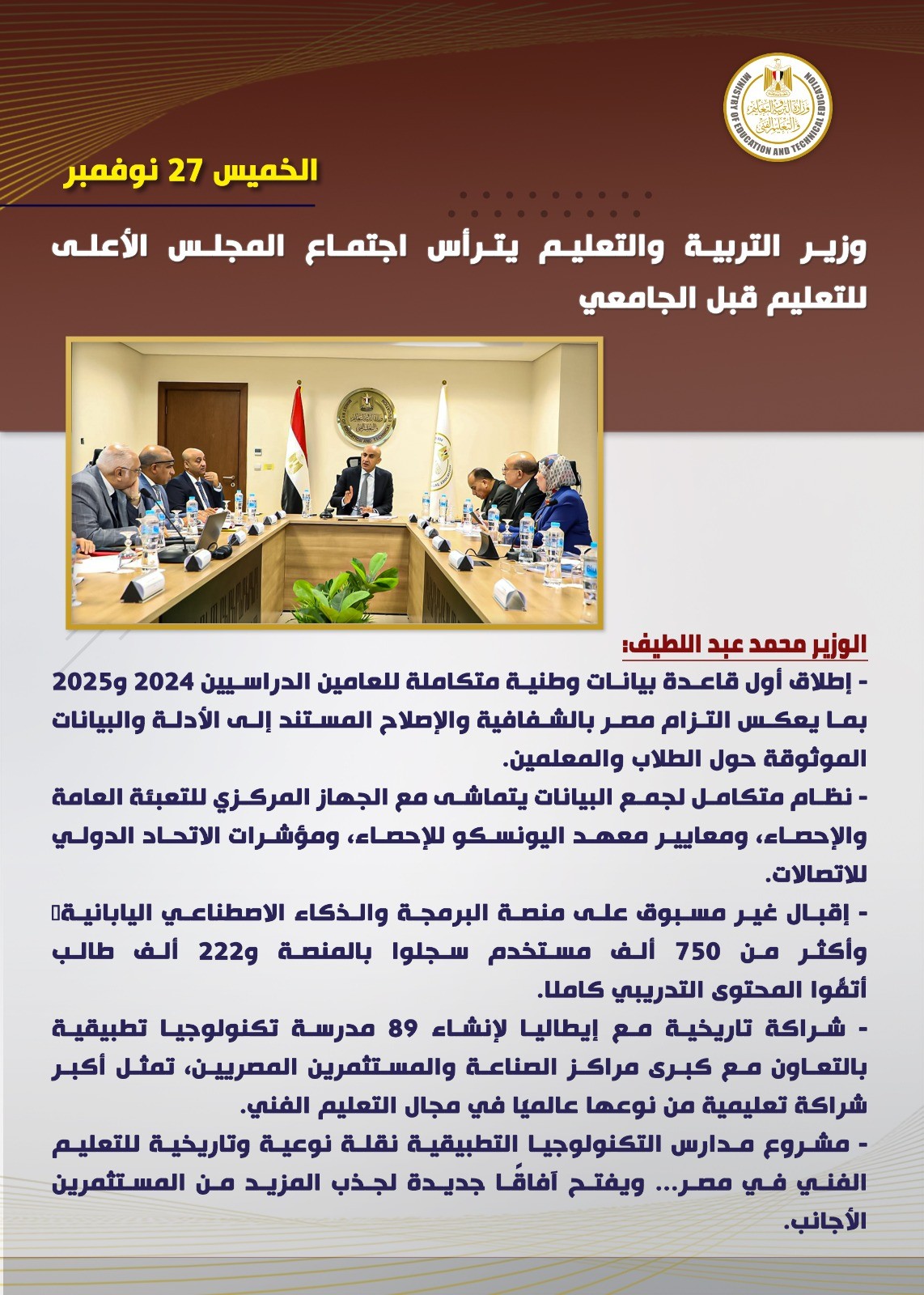 ترأس السيد محمد عبد اللطيف، وزير التربية والتعليم والتعليم الفني، اجتماع المجلس الأعلى للتعليم قبل الجامعي؛ لاستعراض عدد من القرارات والمحاور المهمة التي تستهدف الارتقاء بجودة التعليم، وتطوير السياسات التربوية، ودعم خطط تطوير التعليم قبل الجامعى.