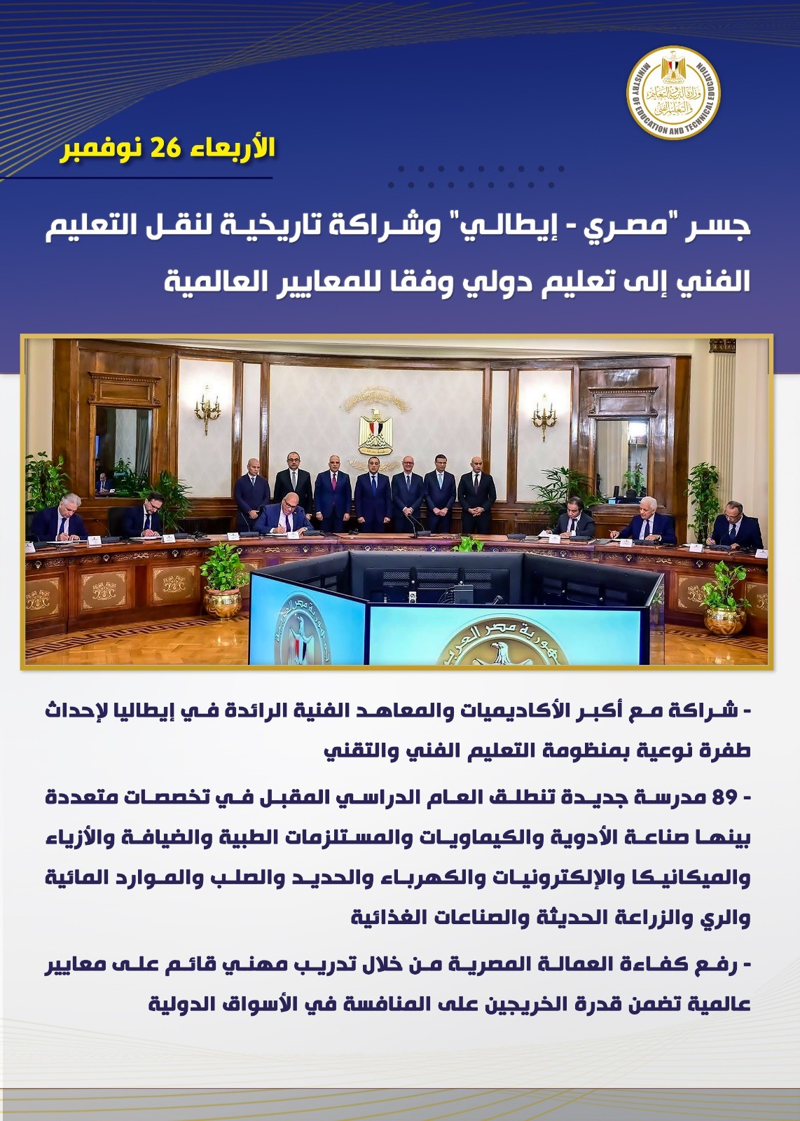 في إطار خطوات تعزيز مسيرة الشراكة المصرية الإيطالية في مجال التعليم الفني، التقى السيد محمد عبد اللطيف وزير التربية والتعليم والتعليم الفني، عددا من ممثلي الأكاديميات والمعاهد الإيطالية الفنية الكبرى، وذلك في إطار التحضيرات لتوقيع عدد من بروتوكلات التعاون غدا مع دولة إيطاليا بمشاركة عدد من الوزارات والهيئات والشركات الكبرى المصرية لإطلاق ٨٩ مدرسة تكنولوجيا تطبيقية جديدة في عدد من التخصصات المختلفة.