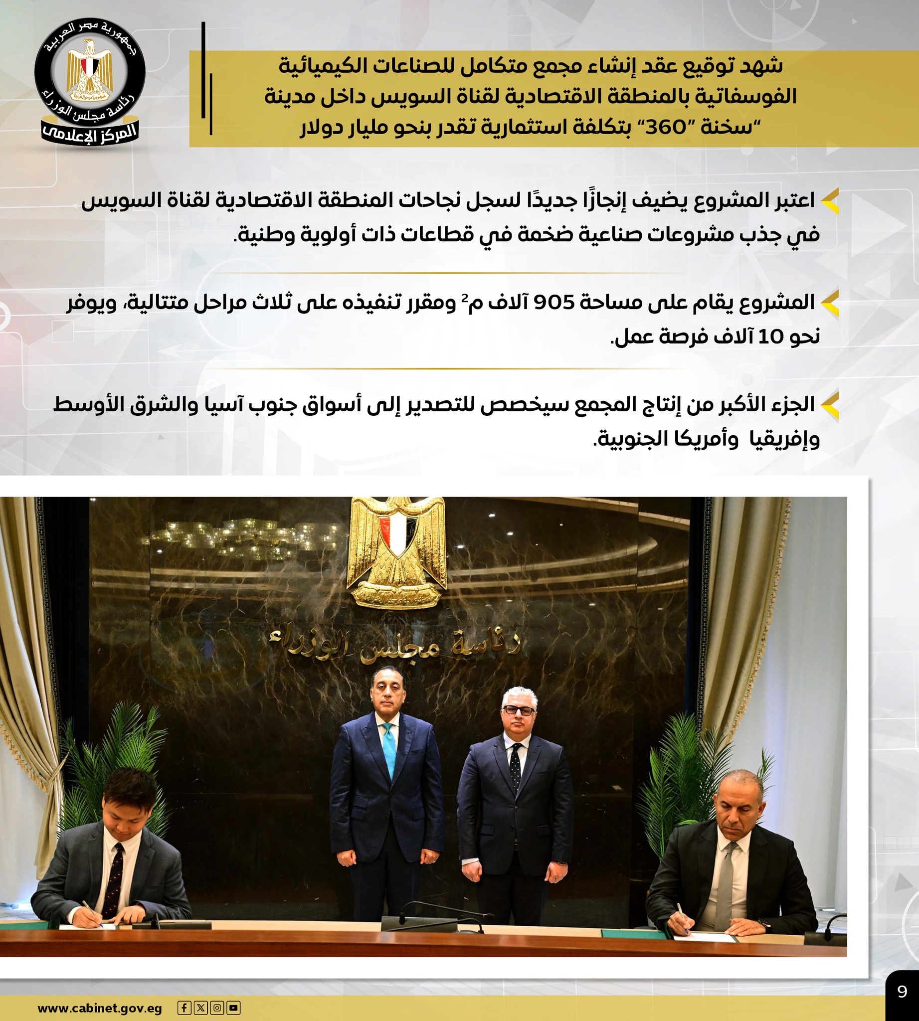 كما شهد توقيع عقد إنشاء مجمع متكامل للصناعات الكيميائية الفوسفاتية داخل مدينة “سخنة “360” بتكلفة استثمارية تقدر بنحو مليار دولار، على مساحة 905 آلاف م2 والمقرر تنفيذه على ثلاث مراحل متتالية، ويوفر نحو 10 آلاف فرصة عمل.