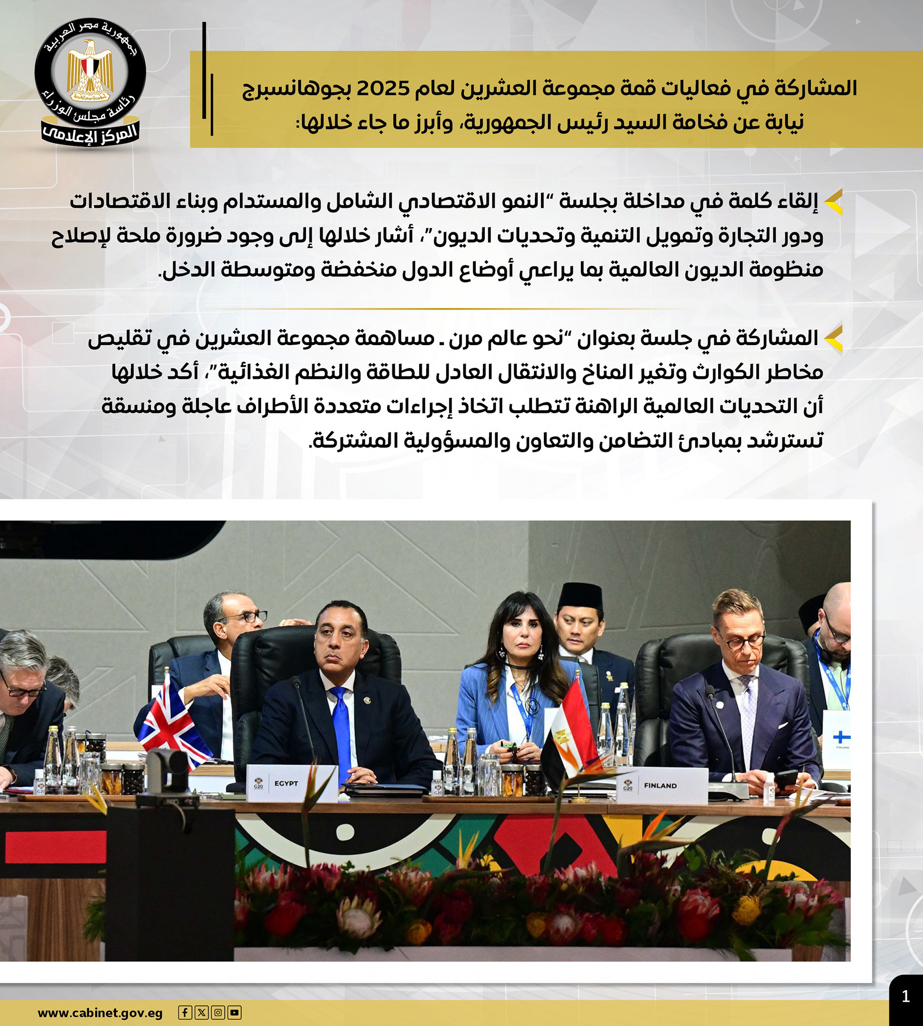 وتضمنت الأنشطة، مشاركة رئيس الوزراء في فعاليات قمة مجموعة العشرين لعام 2025 بجوهانسبرج نيابة عن فخامة الرئيس، حيث أشار في كلمته إلى وجود ضرورة مُلحة لإصلاح منظومة الديون العالمية بما يراعي أوضاع الدول منخفضة ومتوسطة الدخل.
