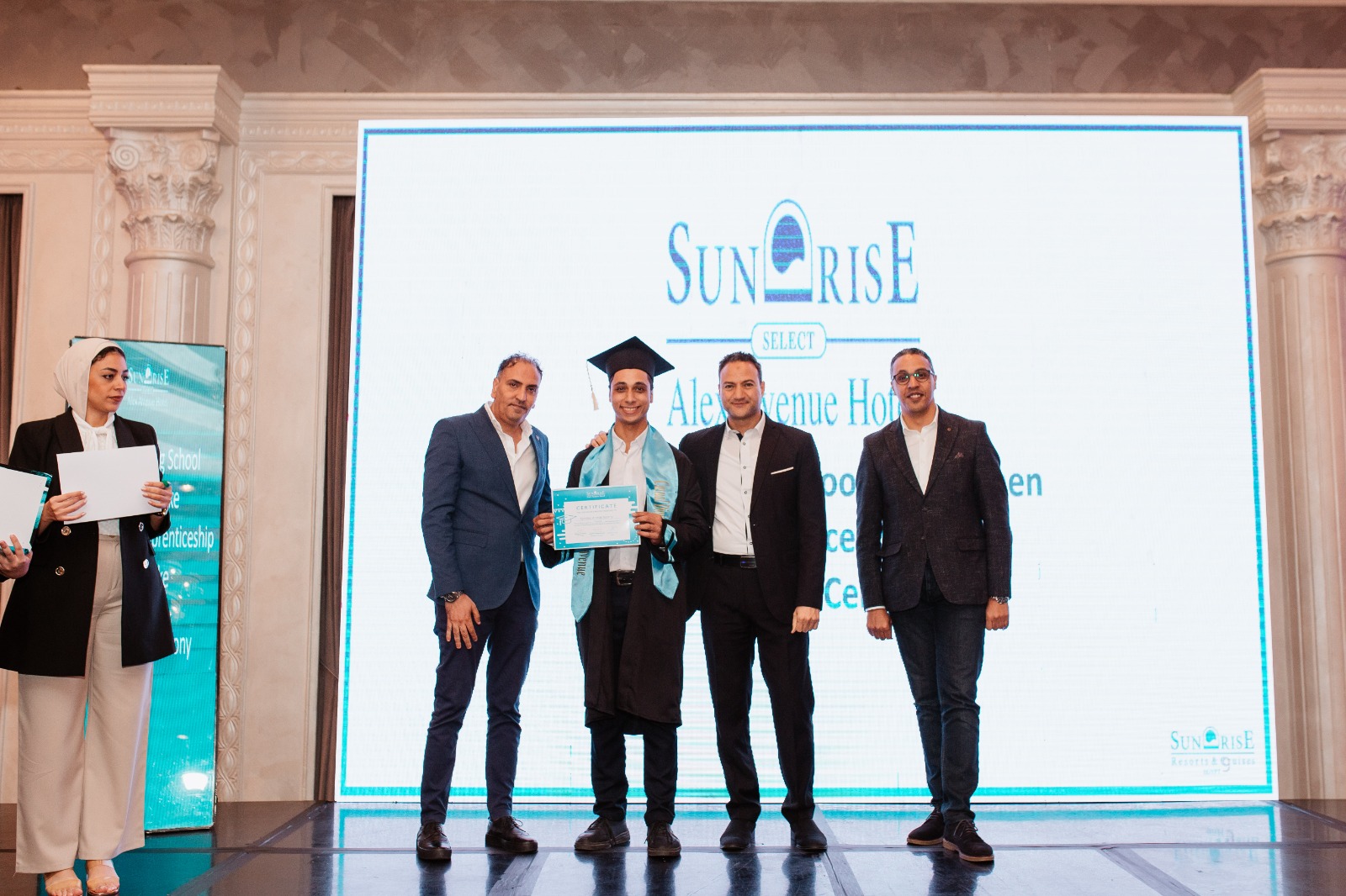 وتم تدريب وتأهيل التدريبين تحت قيادة الدكتور سعيد العتيق المدير التنفيذي لمجموعة صن رايز، ومحمد سامي مدير الموارد البشرية لمجموعة صن رايز، هيثم محمد مدير عام فندق صن رايز اليكس اڤينيو، ونبيل توفيق مساعد مدير الأغدية و المشروبات لفندق صن رايز اليكس اڤينيو.
