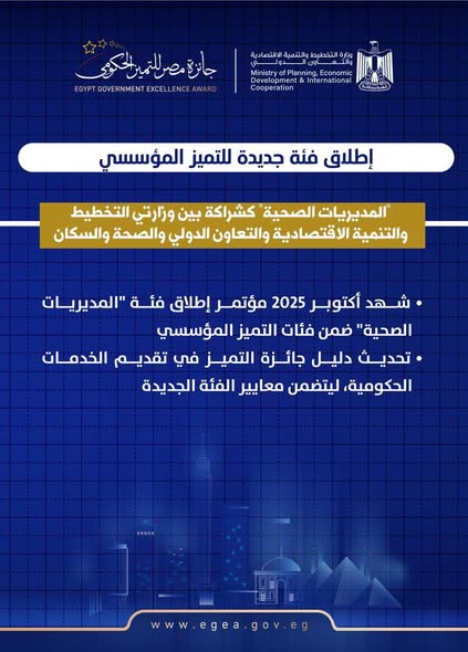 شهد أكتوبر 2025 مؤتمر إطلاق فئة “المديريات الصحية” ضمن فئات التميز المؤسسي في إطار الشراكة بين وزارتي التخطيط والتنمية الاقتصادية والتعاون الدولي والصحة والسكان. لذا تم إعداد وتحديث دليل جائزة التميز في تقديم الخدمات الحكومية، بما يضمن مواءمته مع استحداث فئة المديريات الصحية، وتضمينه المعايير والمؤشرات التي تعكس خصوصية هذا القطاع وأولوياته.