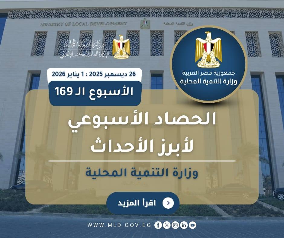 أصدر المركز الإعلامي لوزارة التنمية المحلية “الانفوجراف الأسبوعي” في نسخته الـ 169 حول أبرز أنشطة وفعاليات الوزارة بقيادة الدكتورة منال عوض وزيرة التنمية المحلية، حيث تضمن مجموعة من الفعاليات والاجتماعات ومتابعة المشروعات التنموية المهمة خلال الفترة (26 ديسمبر 2025 : 1 يناير 2026).