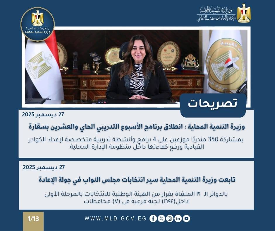 أعلنت الدكتورة منال عوض وزيرة التنمية المحلية والقائم بأعمال وزير البيئة ، عن إنطلاق برامج الأسبوع التدريبي الحادي والعشرين من الخطة التدريبية 2025 / 2026 خلال الفترة من 28 / 12 وحتى 31 / 12 / 2025 بمركز التنمية المحلية للتدريب بسقارة ، مشيرًة إلي أن فعاليات الأسبوع التدريبي الـ 21، تتضمن 4 برامج وأنشطة تدريبية بمشاركة 350 متدربًا من مختلف المحافظات، وذلك في إطار حرص وزارة التنمية المحلية على رفع كفاءة القيادات والعاملين بالجهاز الإداري للمحليات.