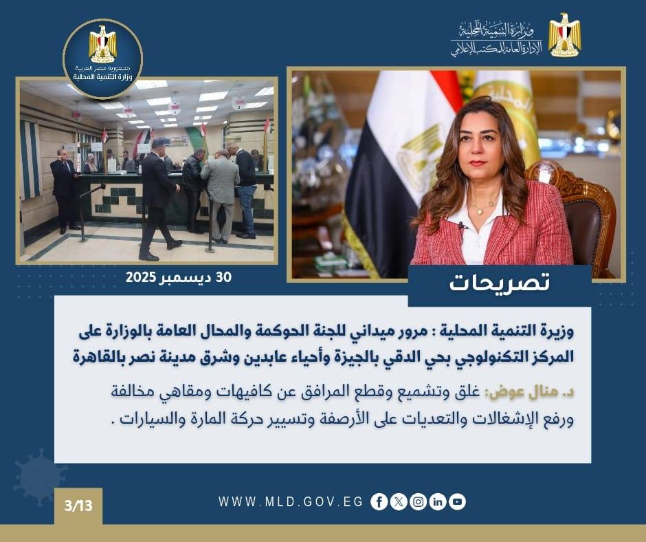 وأعلنت الدكتورة منال عوض وزيرة التنمية المحلية والقائم بأعمال وزير البيئة، عن قيام لجنة من قطاع تقويم الأداء والتفتيش والرقابة والمتابعة بالوزارة بالمرور المفاجئ خلال النصف الأخير من شهر ديسمبر 2025 على أحياء الموسكي وشبرا بمحافظة القاهرة، ومدن وأحياء محافظه البحر الأحمر، لمتابعة أداء المراكز التكنولوجية وموقف طلبات المواطنين وفحص عدد من الملفات المهمة علي رأسها التراخيص والتقنين ومخالفات البناء والمتغيرات المكانية والتصالح ومشروعات الخطة الاستثمارية.