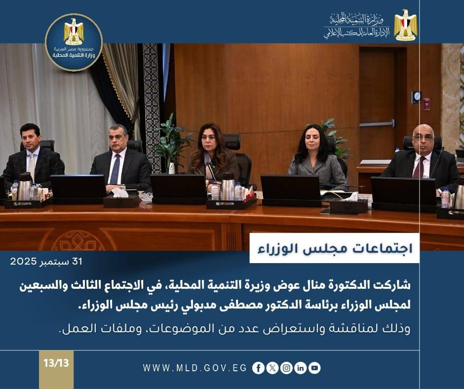 كما شاركت الدكتورة منال عوض وزيرة التنمية المحلية والقائم بأعمال وزيرة البيئة، في الاجتماع الأسبوعي للحكومة في مقرها بالعاصمة الجديدة؛ برئاسة الدكتور مصطفى مدبولي، رئيس مجلس الوزراء، وذلك لمناقشة عدد من الملفات والموضوعات.