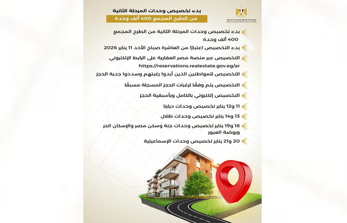 أعلنت وزارة الإسكان والمرافق والمجتمعات العمرانية، عن البدء في تخصيص الوحدات السكنية للمرحلة الثانية من الطرح المجمع ٤٠٠ ألف وحدة عبر منصة مصر العقارية، وذلك اعتباراً من الساعة العاشرة صباح غد الأحد الموافق ١١/١/٢٠٢٦، لكافة المواطنين الذين قاموا بإبداء رغبتهم في حجز وحداتهم وقاموا بسداد جدية الحجز وفقا لرغباتهم.