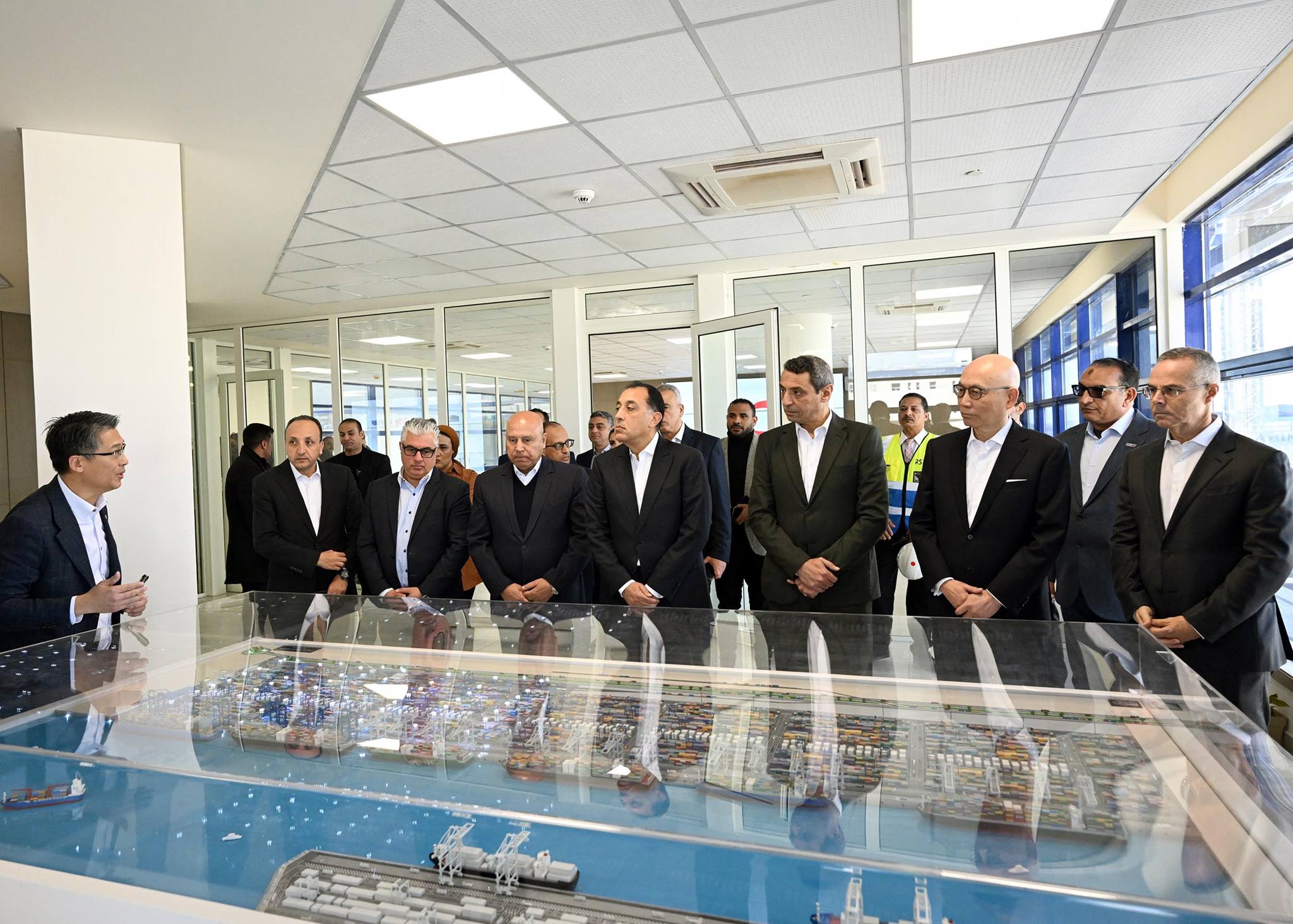 وفي البداية، توجه رئيس الوزراء ومرافقوه لتفقد غرفة التحكم للمحطة؛ حيث تم الاستماع لشرح من السيد/ “كاهو وونغ” عن آلية عمل الغرفة، ودورها في التحكم في أوناش الرصيف ـ البالغ عددها 6 أوناش عملاقةSTS) ) ـ والتي تعد من رافعات المناولة العملاقة القادرة على التعامل مع السفن ذات الحمولات الكبيرة، وأهميتها في تسريع دورة تداول الحاويات ورفع كفاءة الأداء بالمحطة، وكذلك أوناش الساحة الأوتوماتيكية RTG Cranes))، والبالغ عددها 18 ونشا تعمل آليًا داخل الساحات، وتعتمد على أنظمة ذكية في تحديد مواقع الحاويات وترتيبها، مما يقلل من الأخطاء البشرية، ويعزز من الكفاءة التشغيلية للمحطة، كما تم متابعة أعمال تفريغ الحاويات باستخدام الأوناش العملاقة.