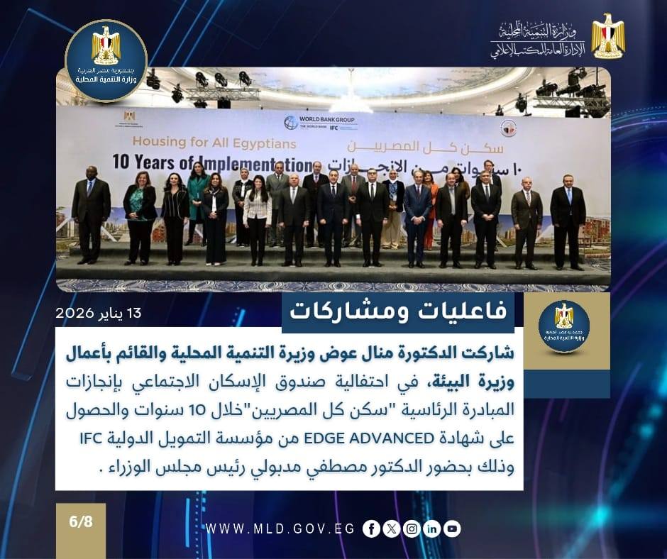 كما شاركت الدكتورة منال عوض وزيرة التنمية المحلية والقائم بأعمال وزير البيئة، في الاحتفالية التي نظمها صندوق الإسكان الاجتماعي ودعم التمويل العقاريّ بالعاصمة الجديدة؛ بحضور الدكتور مصطفى مدبولي، رئيس مجلس الوزراء، وذلك للاحتفال بإنجازات المبادرة الرئاسية “سكن كل المصريين” خلال 10 سنوات، وذلك بالتعاون مع برنامج تمويل الإسكان الشامل بمجموعة البنك الدوليّ، وكذلك الحصول على شهادة EDGE ADVANCED من مؤسسة التمويل الدولية IFC .