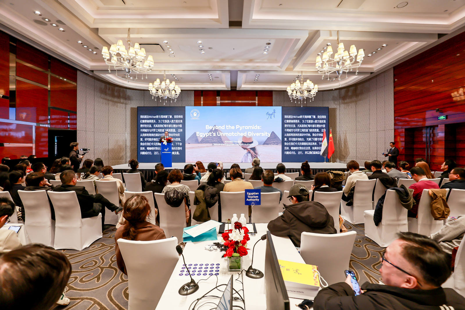 وترأس الوفد المصري الدكتور أحمد يوسف، الرئيس التنفيذي للهيئة المصرية العامة للتنشيط السياحي، والذي ضم المستشار هيثم عبد الهادي نائب السفير المصري لدى بكين، والدكتور نادر الببلاوي رئيس مجلس إدارة غرفة شركات ووكالات السفر والسياحة، والأستاذة بسمة عزت مدير إدارة آسيا والباسفيك ومسئول الملف الصيني بالهيئة، والأستاذة نانسي نادي عضو الإدارة العامة للترويج السياحي بالإدارة المركزية للتسويق السياحي بالهيئة، إلى جانب ممثلين عن شركة مصر للطيران، ونخبة من ممثلي القطاع السياحي الخاص المصري شملت ست شركات سياحة وفندقين.