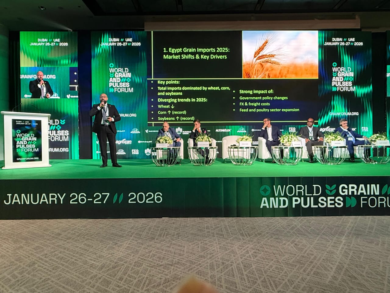 وأشار السباعي إلى أن مشاركته في جلسات المنتدى والعرض التقديمي الذي قدمه ركّز على تحليل تطورات سوق الحبوب في مصر خلال عام 2025، موضحاً أن واردات القمح سجلت تراجعاً إلى نحو 13.1 مليون طن، نتيجة انخفاض مشتريات الجهات الحكومية وزيادة التوريد المحلي، في مقابل قفزات تاريخية في واردات الذرة وفول الصويا مدفوعة بالنمو السريع في قطاع الأعلاف والدواجن ومصنعاتها والتوسع في صناعات النشا والجلوكوز.