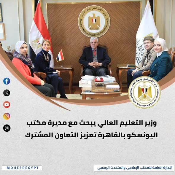 استقبل الدكتور أيمن عاشور، وزير التعليم العالي والبحث العلمي ورئيس اللجنة الوطنية المصرية للتربية والعلوم والثقافة، الدكتورة نوريا سانز، مديرة مكتب منظمة اليونسكو الإقليمي بالقاهرة، وخلال اللقاء، أكد الوزير حرص مصر على تعميق التعاون مع منظمة اليونسكو في مجالات التعليم العالي والبحث العلمي والابتكار، مشيدًا بدور الدكتورة نوريا سانز في تسهيل التعاون المشترك، وذلك خلال فترة عملها كمديرة للمكتب الإقليمي للمنظمة بالقاهرة، وبحث الطرفان تعزيز كفاءة الكوادر البشرية بالمكتب، بما يسهم في تحسين آليات العمل وتوسيع نطاق المبادرات المشتركة مع الوزارات والمؤسسات البحثية المختلفة.