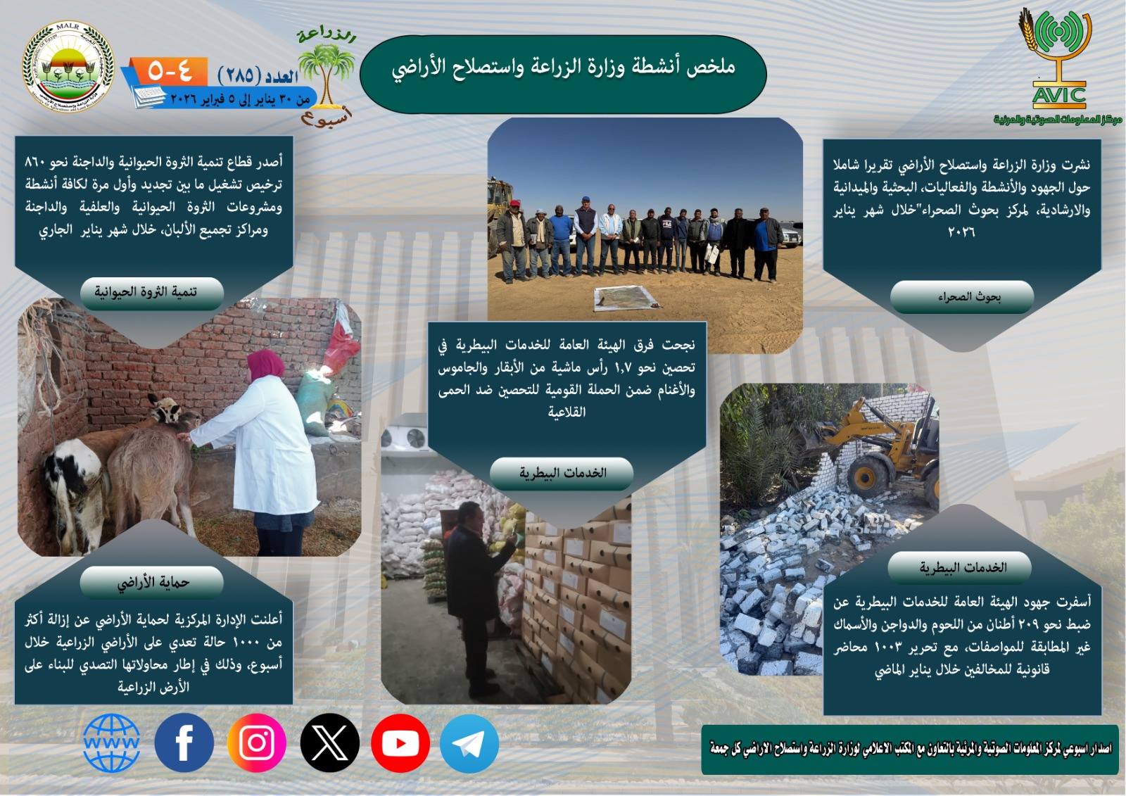 أصدر مركز المعلومات الصوتية والمرئية بوزارة الزراعة واستصلاح الأراضي، “الانفوجراف الاسبوعي” في نسخته رقم 285 حول الحصاد الاسبوعي لأهم أنشطة الوزارة، خلال الاسبوع الماضي في الفترة من 30 يناير وحتى 5 فبراير الجاري، كما أصدر المركز ايضا ملخصا بالفيديو، حول انشطة الوزارة خلال نفس الفترة.