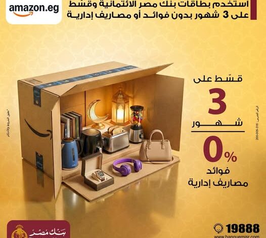 أعلن بنك مصر عن طرح عرض مميز لحاملي البطاقات الائتمانية، حيث يمكنهم تقسيط مشترياتهم على 3 أشهر بدون فوائد أو مصاريف إدارية عند الشراء من منصة Amazon عبر تطبيقها أو موقعها الإلكتروني.