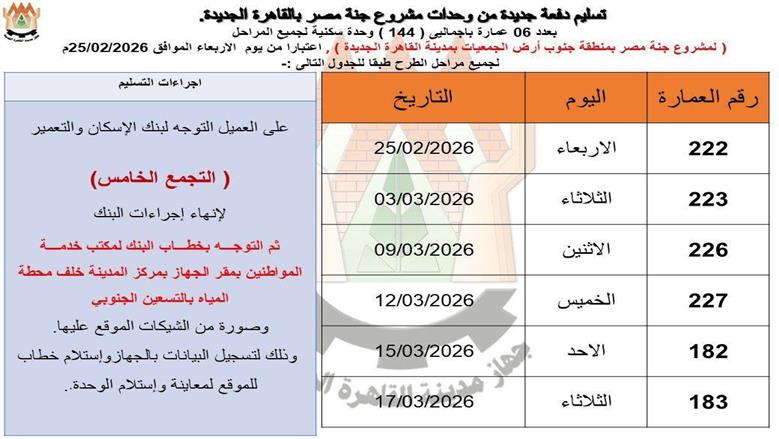 وفقا للمعلن من قبل جهاز مدينة القاهرة الجديدة، جاء جدول مواعيد تسليم دفعة جديدة من شقق «جنة»، كالتالي: