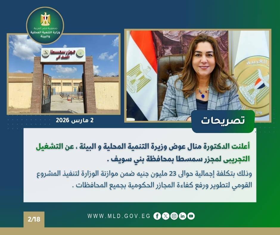 أعلنت الدكتورة منال عوض وزيرة التنمية المحلية والبيئة، عن التشغيل التجريبى لمجزر سمسطا بمحافظة بني سويف بتكلفة إجمالية تقدر بحوالي 23 مليون جنيه ضمن موازنة الوزارة لتنفيذ المشروع القومي لتطوير ورفع كفاءة المجازر الحكومية بجميع المحافظات .