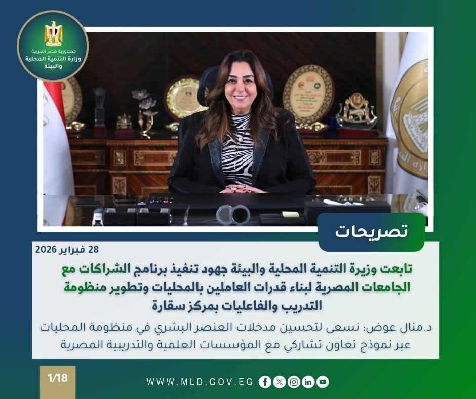 تلقت الدكتورة منال عوض وزيرة التنمية المحلية والبيئة، تقريرًا مفصلًا حول مستجدات تنفيذ برنامج بناء القدرات بالتنمية المحلية والبيئة والشراكات مع الجامعات المصرية الراغبة فى الإنضمام إلى مبادرة الوزارة لبناء الكوادر البشرية بالتعاون مع الجامعات، إلى جانب متابعة الأنشطة التدريبية والعلمية وخطة تطوير التدريب المعتمدة لمركز سقارة، حيث أشار التقرير إلي أن الوزارة تمضي بخطوات متسارعة في تنفيذ مبادرة بناء الكوادر البشرية بالتعاون مع عدد من الجامعات والمؤسسات الأكاديمية المصرية، في إطار خطة تطوير التدريب وبناء الإنسان بالمحليات وفق برنامج عمل الحكومة 2024–2027.