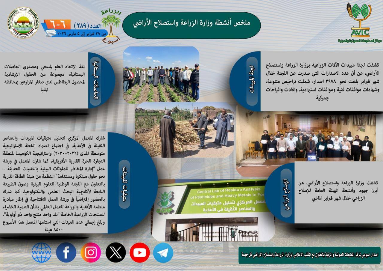 كما نشرت وزارة الزراعة واستصلاح الأراضي، التقرير الشهري للأنشطة البحثية والتنموية والخدمية التي نفذها مركز بحوث الصحراء، في مناطق عمله خاصة في سيناء ومطروح والمناطق الحدودية، خلال شهر فبراير، كذلك واصل الجهاز التنفيذي لمشروعات تحسين الأراضي، أعمال التطهير بمحافظة الأقصر، وذلك تزامنا مع بدء موسم كسر محصول قصب السكر، كذلك أعلنت وزارة الزراعة واستصلاح الأراضي، عن تنفيذ سلسلة من التحركات الميدانية واللقاءات التوجيهية شملت محافظتي الجيزة والغربية، لضبط منظومة توزيع مستلزمات الإنتاج وعلى رأسها الأسمدة.