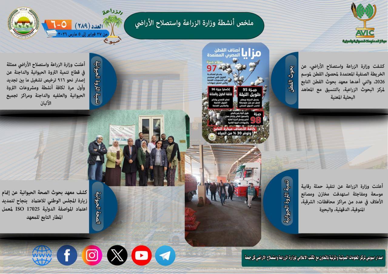 وكشفت وزارة الزراعة واستصلاح الأراضي، عن الخريطة الصنفية المعتمدة لمحصول القطن لموسم 2026، والتي أعدها معهد بحوث القطن التابع لمركز البحوث الزراعية، بالتنسيق مع المعاهد البحثية المعنية، كما أعلن قطاع تنمية الثروة الحيوانية والداجنة عن إصدار نحو 916 ترخيص تشغيل ما بين تجديد وأول مرة لكافة أنشطة ومشروعات الثروة الحيوانية والعلفيه والداجنة ومراكز تجميع الألبان، كذلك تم تنفيذ حملة رقابية موسعة ومفاجئة استهدفت مخازن ومصانع الأعلاف في عدد من مراكز محافظات: الشرقية، المنوفية، الدقهلية، والبحيرة