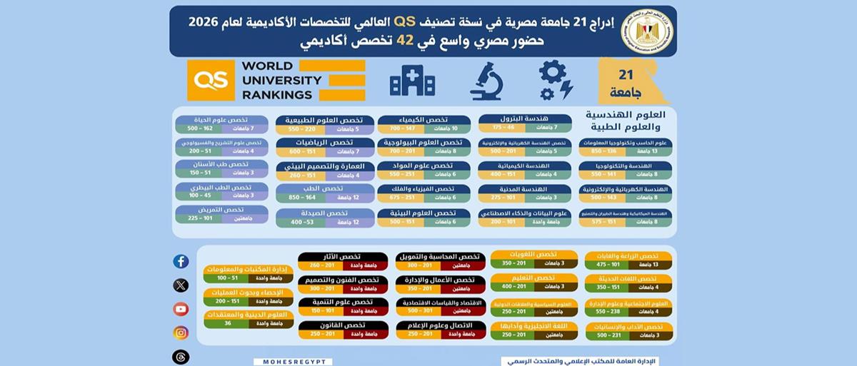 وجاءت نتائج الجامعات المصرية داخل التخصصات العلمية في تصنيف QS لعام 2026 على النحو التالي: