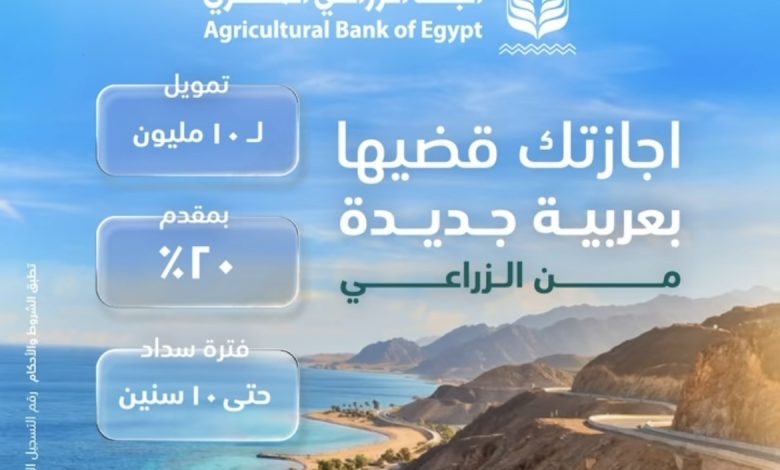 أعلن البنك الزراعي المصري عن عرض تمويلي مميز لمساعدة عملائه على قضاء إجازاتهم بالسيارة التي يحلمون بها، سواء كانت رحلة إلى السخنة أو الجونة، مع الجمع بين رفاهية السيارة وراحة البال في السداد.