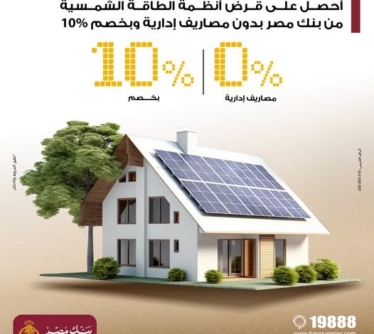 بنك مصر يطلق برنامج تمويل ألواح الطاقة الشمسية للمنازل بخصم 10% وبدون مصاريف إدارية