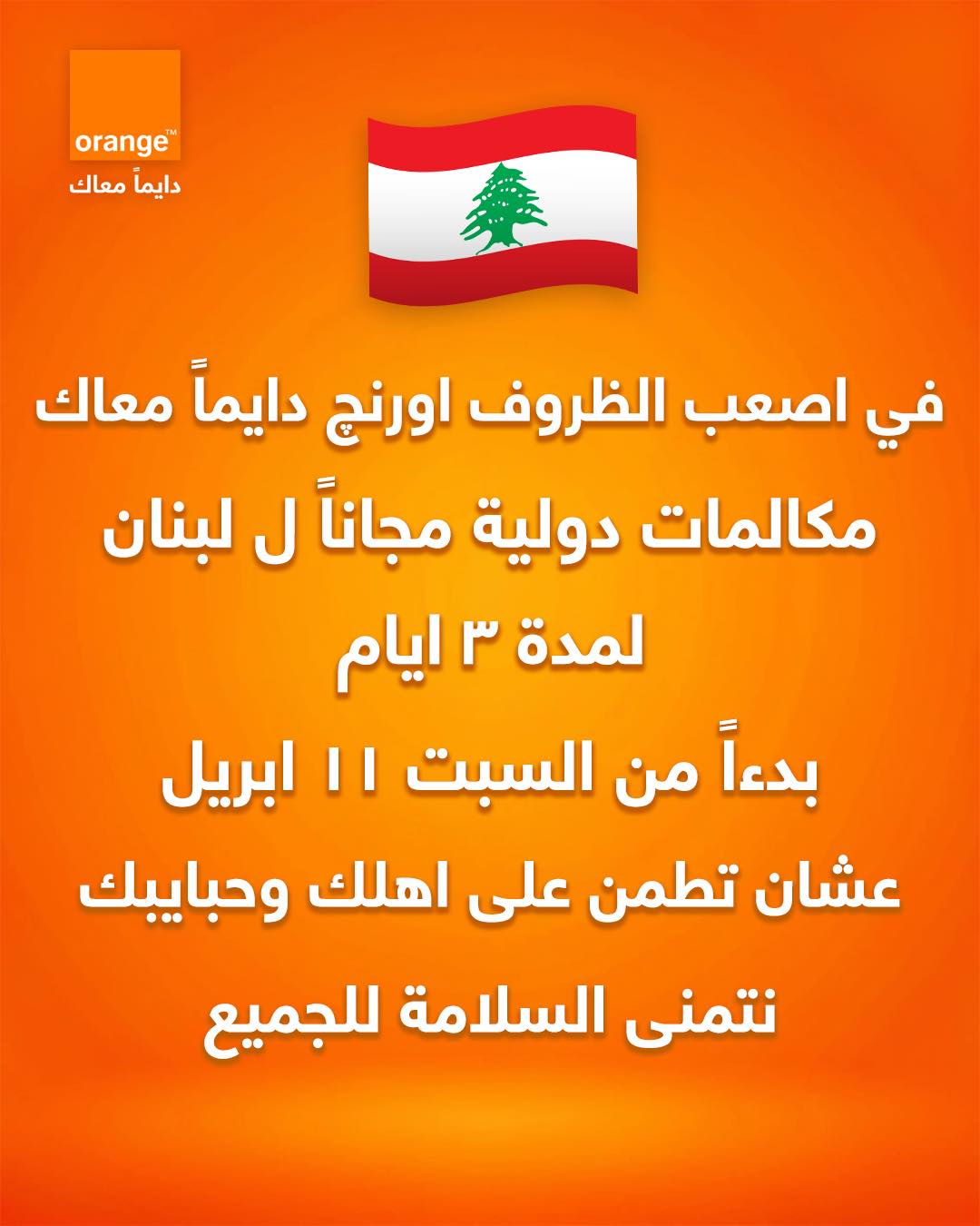 أعلنت شركة أورنـج مصر على مساندة ودعم عملائنا للاطمئنان على سلامة ذويهم في ظل الاحداث الراهنة ليك ٥ دقائق دولية لمدة ٣ ايام ابتداء من غدا السبت ١١ ابريل – هذه المبادرة بالتعاون مع الجهاز القومي لتنظيم الإتصالات – تطبق الشروط والاحكام